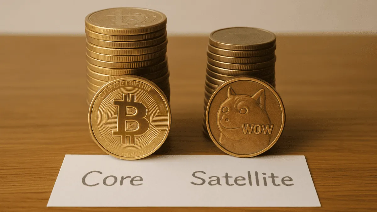 どの通貨も将来性やテーマ性はありますが、すべてを同じ比重で積み立ててしまうと、どうしてもリスクが高くなりがちです。そこで本記事では、「土台をつくるコア資産」と「少額で試すサテライト資産」という2つの役割に分けて、18通貨を整理していきます。